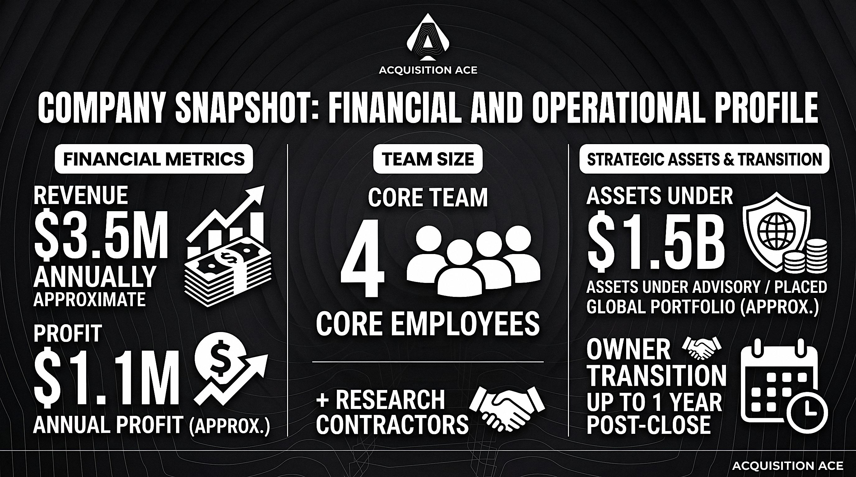 The firm has approximately $1.5B in assets placed or under active advisory relationships, built over years of trust with institutional clients.